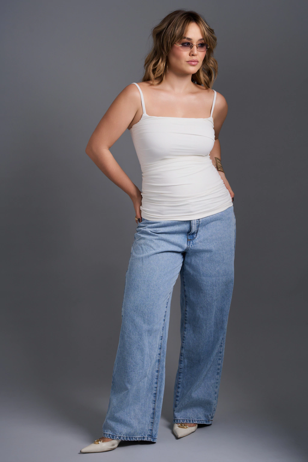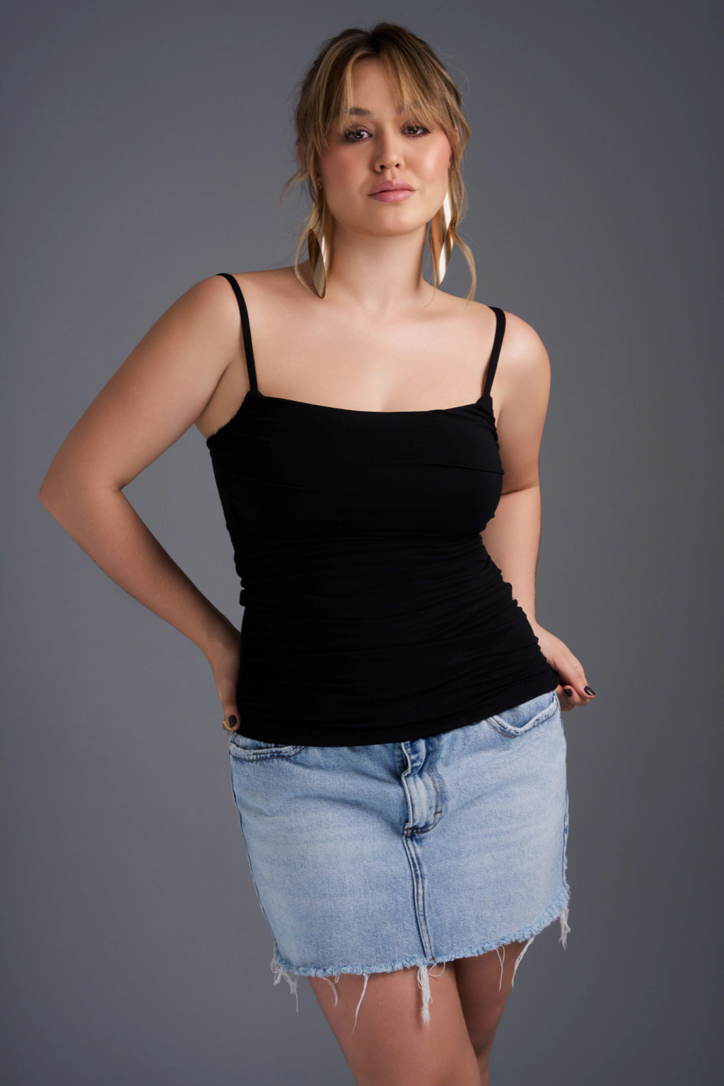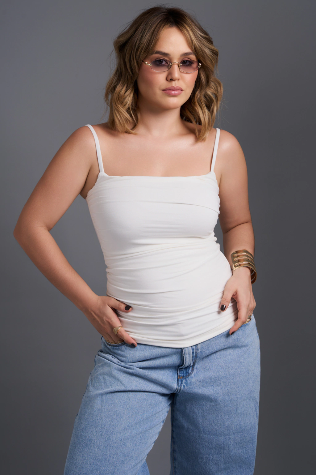 Blusa dupla que une o conforto e elegância em uma modelagem ajustada ao corpo. Confeccionada com acabamento em elástico no decote, costas e alças, proporciona ajuste perfeito e segurança ao vestir. Os franzidos delicados nas laterais adicionam movimento e delicadeza ao design, resultando em uma peça versátil e sofisticada.