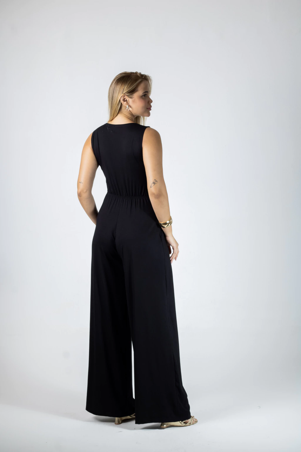 O macacão Renata une elegância atemporal e conforto em um design sofisticado. Com modelagem justa na parte superior e caimento amplo nas pernas, valoriza a silhueta com equilíbrio e fluidez. O decote em V alonga o colo com delicadeza, enquanto o acabamento duplo no busto oferece sustentação e um visual impecável. O destaque fica por conta do drapeado central, arrematado por uma fivela metálica, que adiciona um toque refinado ao look. Nas costas, o elástico garante ajuste confortável e discreto, mantendo a elegância do conjunto.