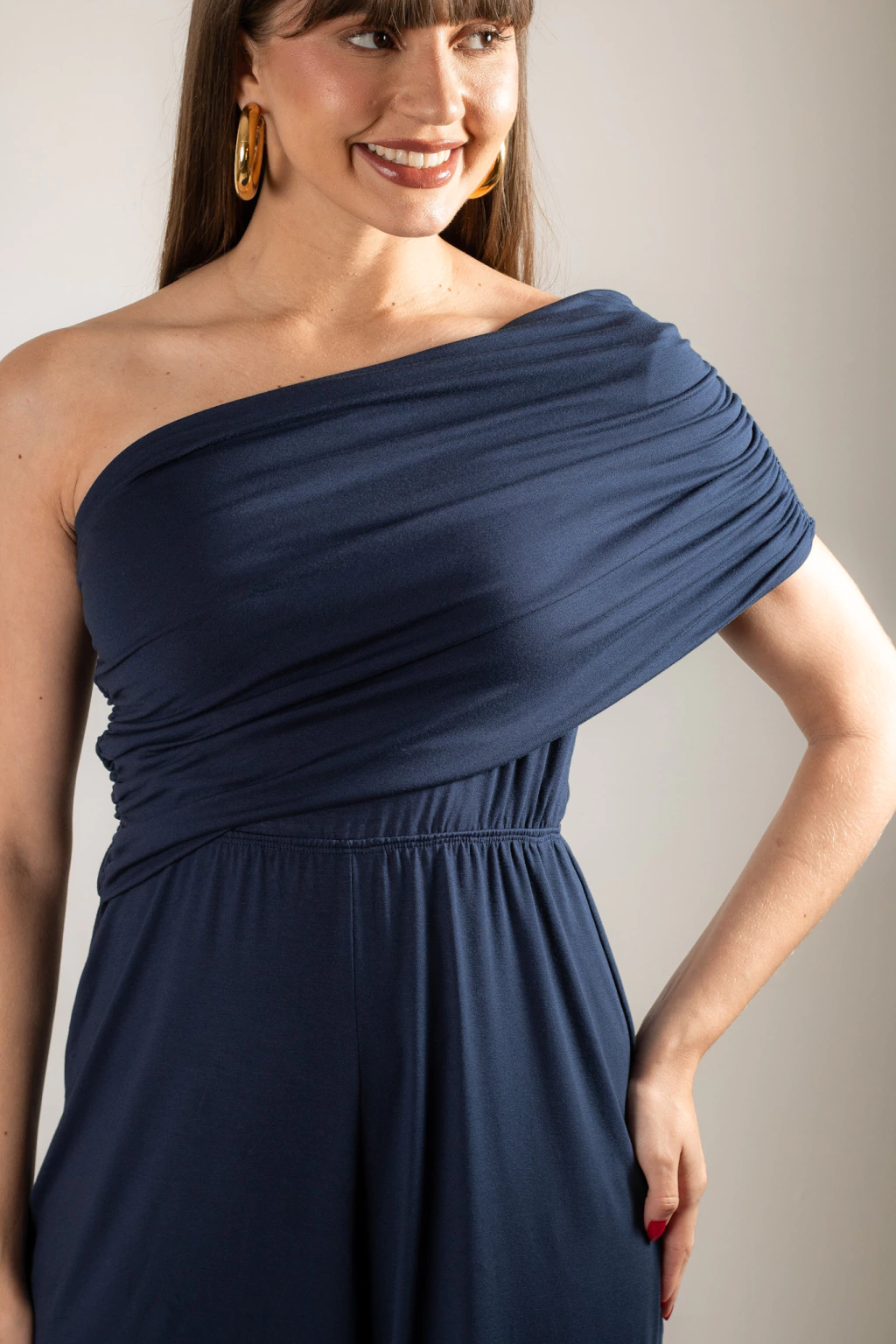 O macacão combina sofisticação e conforto em um design contemporâneo. Sem mangas e com modelagem justa na parte superior, chama atenção pela sobreposição dupla no ombro, totalmente drapeada, que confere volume sutil e um toque de elegância ao visual. A cintura com elástico oferece ajuste confortável e define a silhueta com leveza. A parte inferior, de modelagem ampla, garante fluidez ao caminhar e compõe uma silhueta equilibrada e imponente.