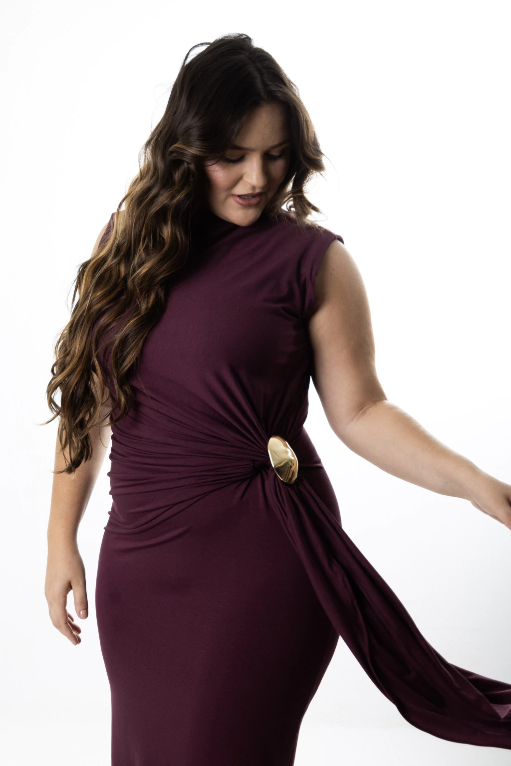 Vestido longo de modelagem slim que traduz requinte e sofisticação em cada detalhe. Confeccionado em malha premium, oferece caimento impecável e toque macio, proporcionando conforto e elegância. A parte frontal é marcada por um delicado drapeado que se estende do ombro até a cintura, finalizado com uma fivela de metal cataforético dourada que confere brilho sutil e sofisticado ao look. A gola alta e o ombro estruturado, com busto duplo, criam uma silhueta imponente e refinada, exaltando a postura e o porte com elegância. Nas costas, a abertura em gota com botão dourado adiciona um toque feminino e inesperado, revelando a pele de forma discreta e charmosa.